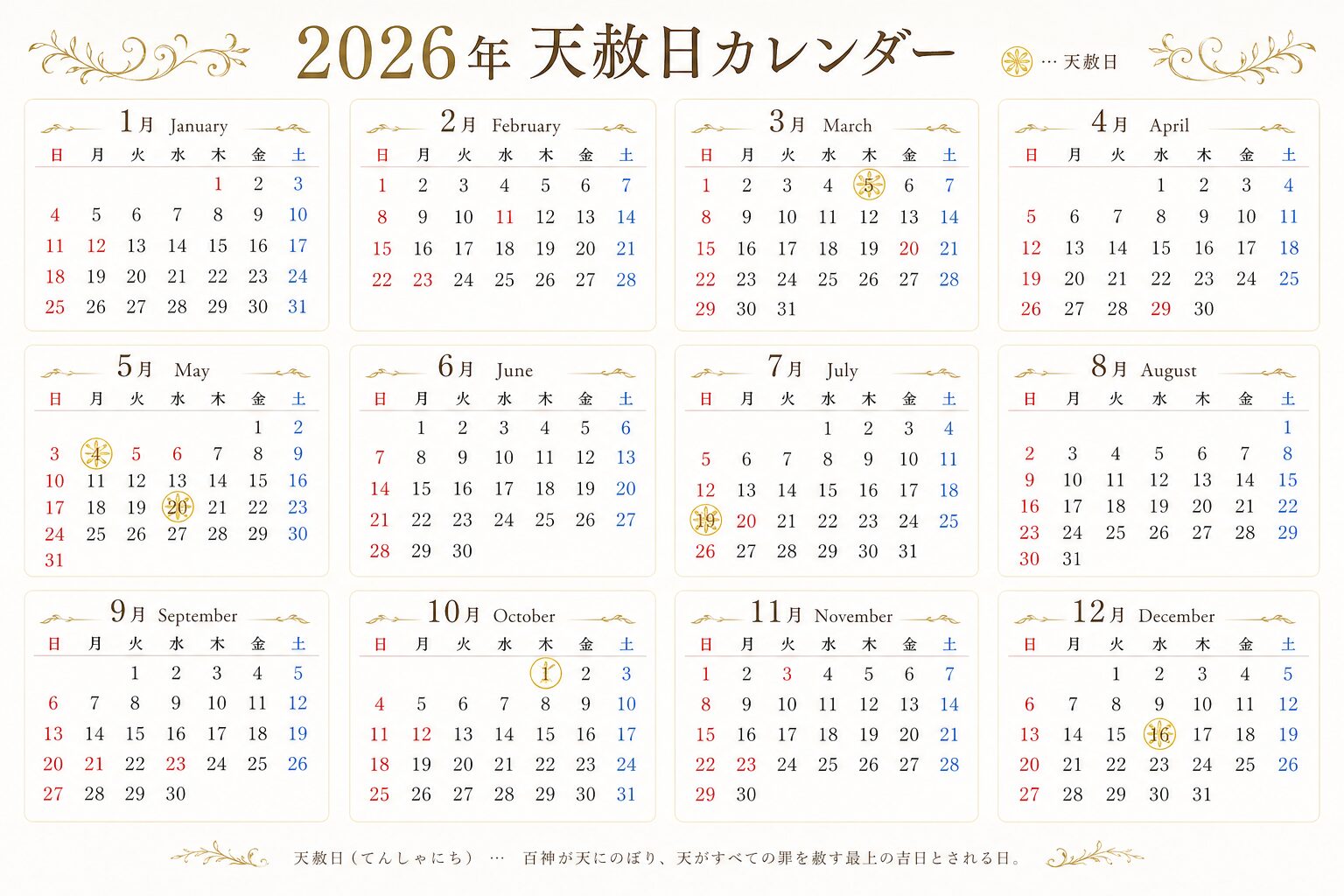2026年の天赦日は、3月5日、5月4日、5月20日、7月19日、10月1日、12月16日です。