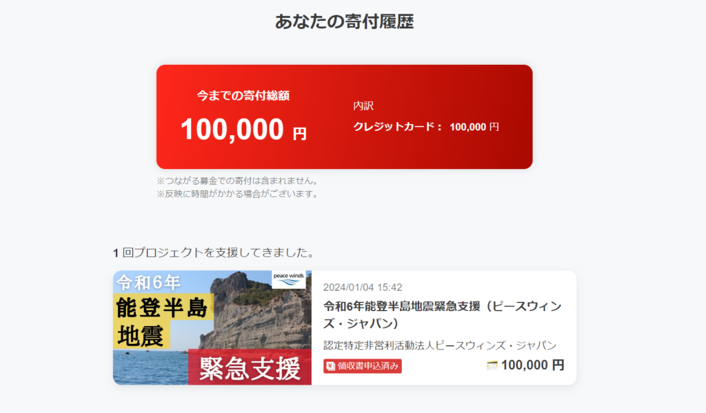 令和6年能登半島地震緊急支援(ピースウィンズ・ジャパン)Yahoo!ネット募金への2024年1月の寄付【100,000円】