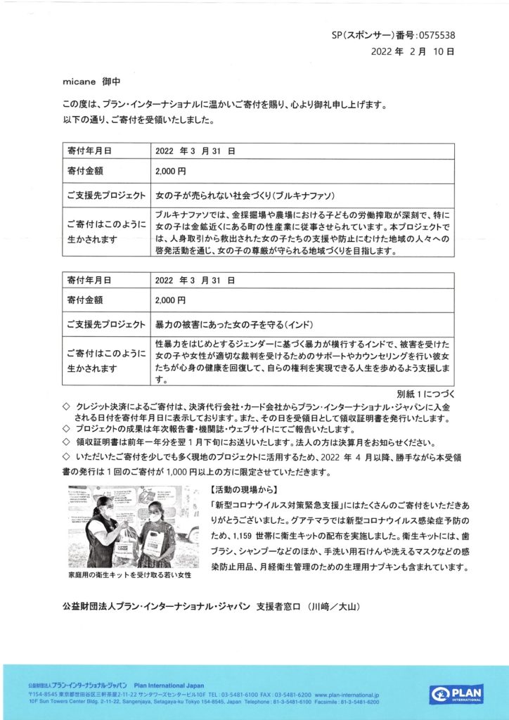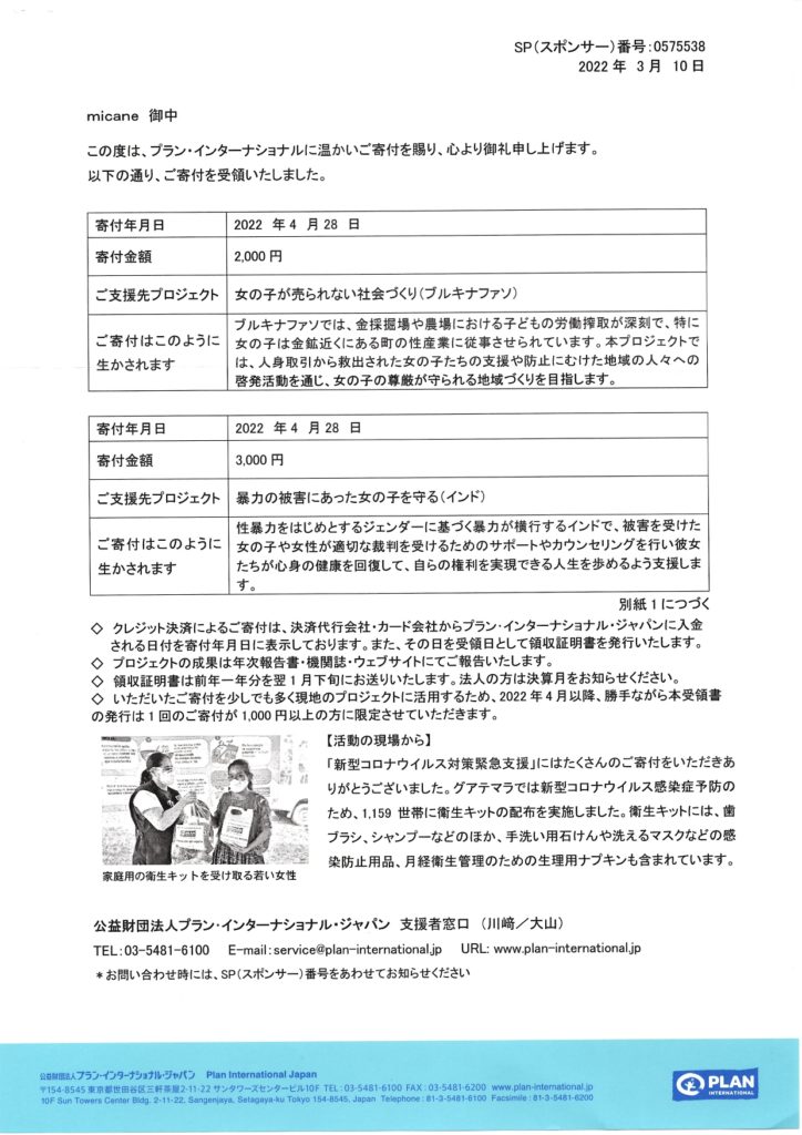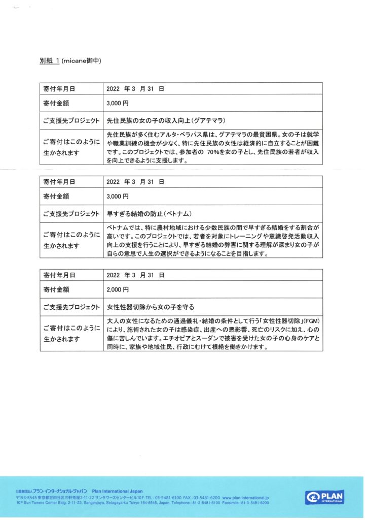 - 18 国際NGOプラン・インターナショナルへの2022年3月の寄付【15000円】