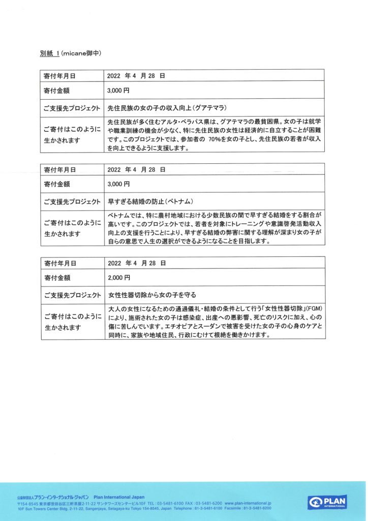 - 19 国際NGOプラン・インターナショナルへの2022年4月の寄付【14000円】