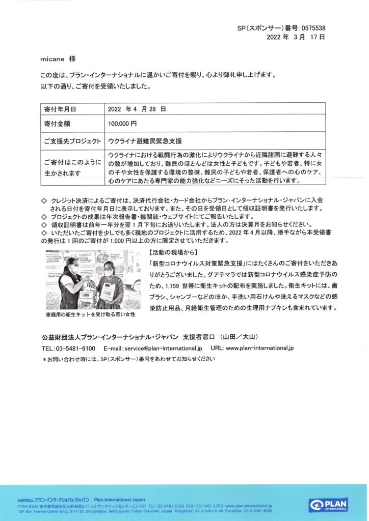 - 17 国際NGOプラン・インターナショナルへのウクライナ避難民緊急支援の寄付【100,000円】