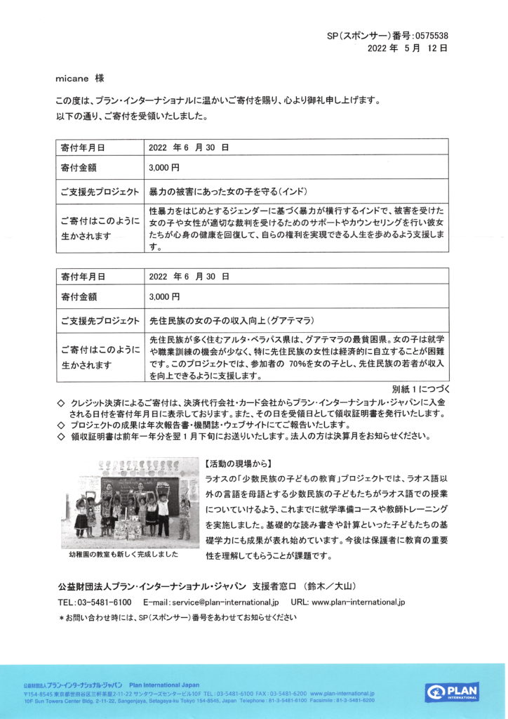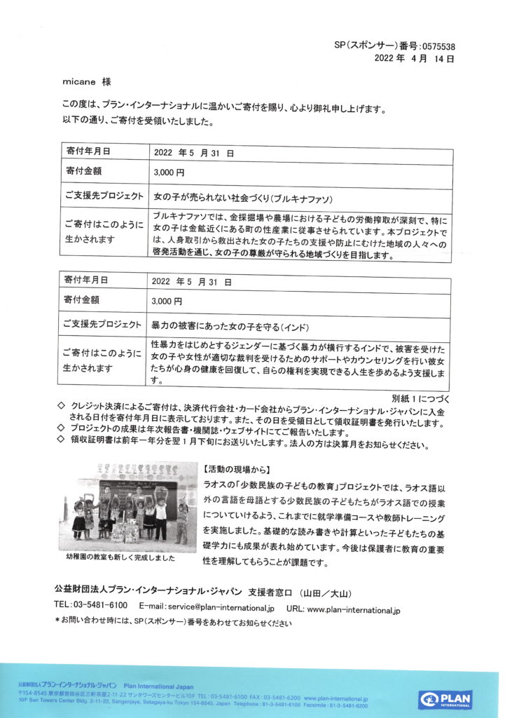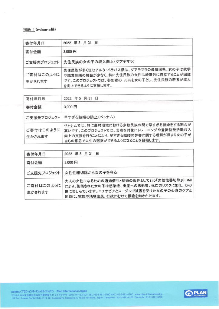 - 20 国際NGOプラン・インターナショナルへの2022年5月の寄付【16000円】