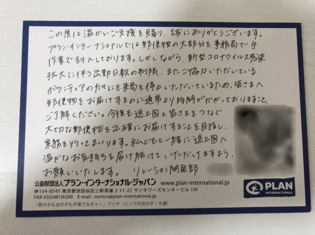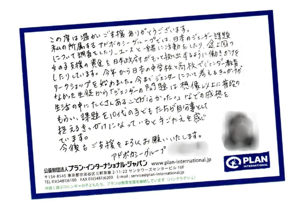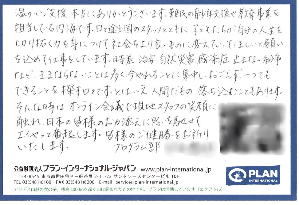 プラン・インターナショナル・ジャパンのK様からもメッセージを頂きました