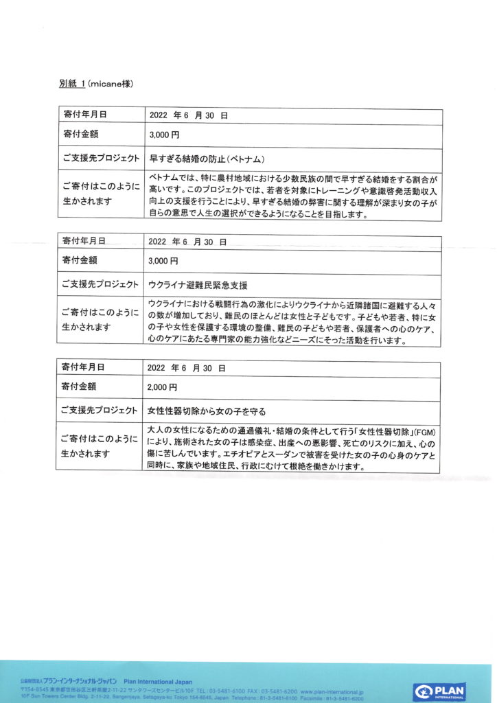 国際NGOプラン・インターナショナルへの2022年6月の寄付【16000円】