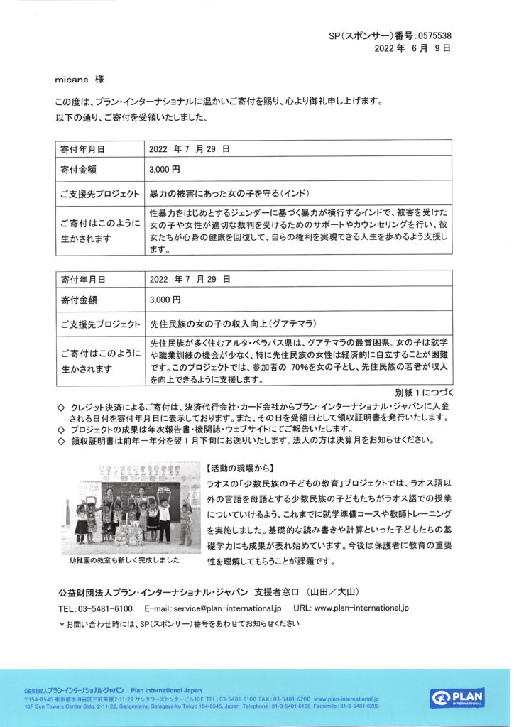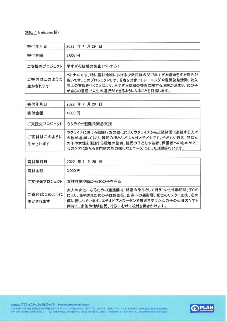 - 22 国際NGOプラン・インターナショナルへの2022年7月の寄付【12000円】