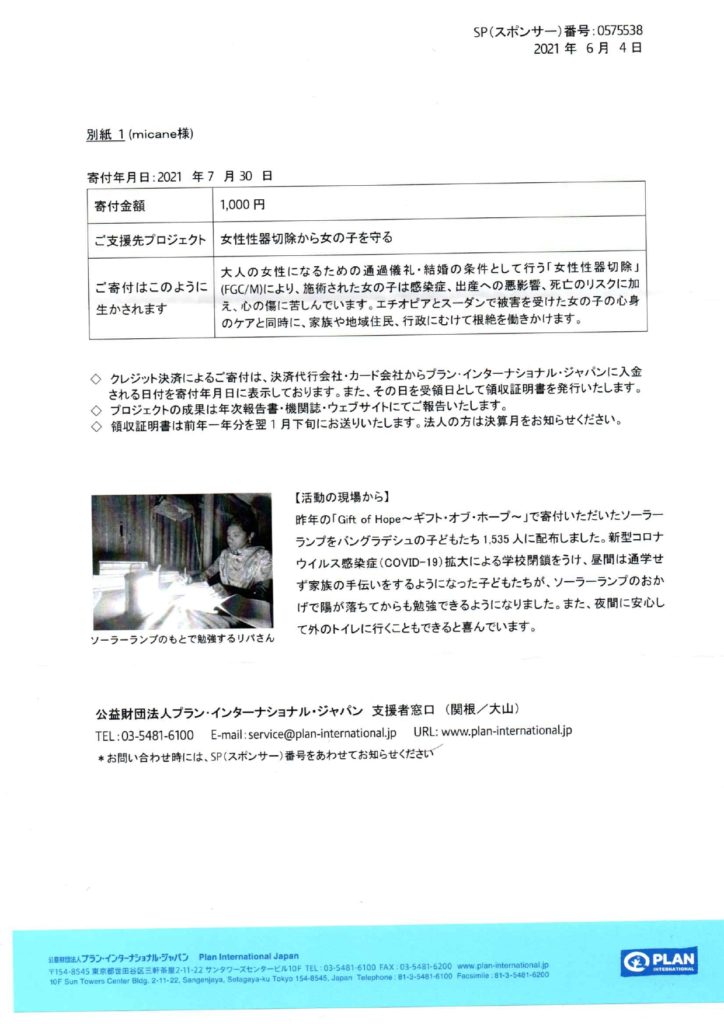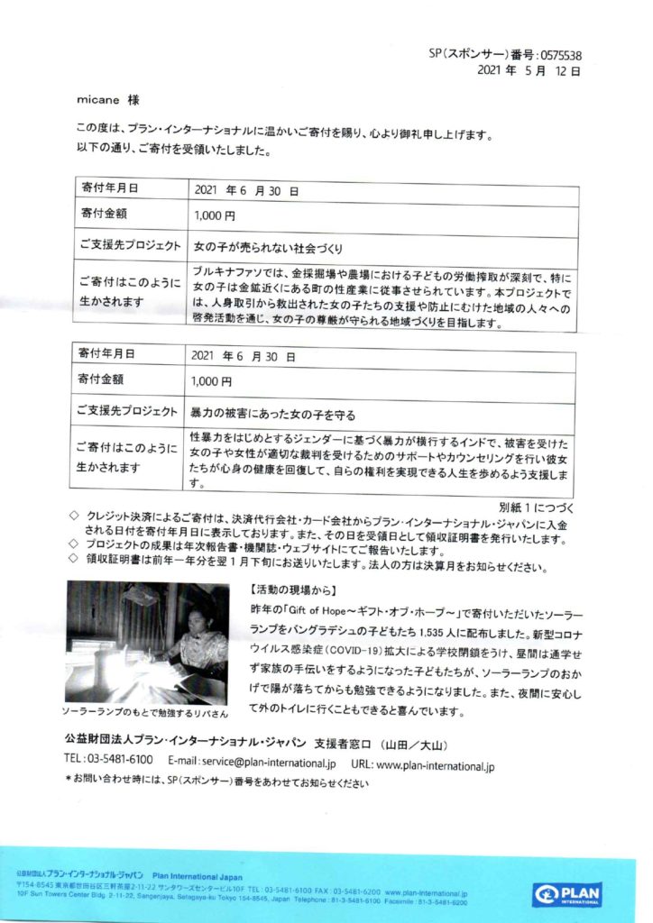 - 7 国際NGOプラン・インターナショナルへの2021年5月の寄付【5000円】