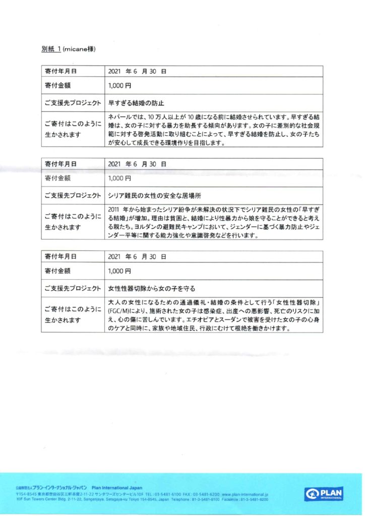 - 8 国際NGOプラン・インターナショナルへの2021年6月の寄付【10000円】