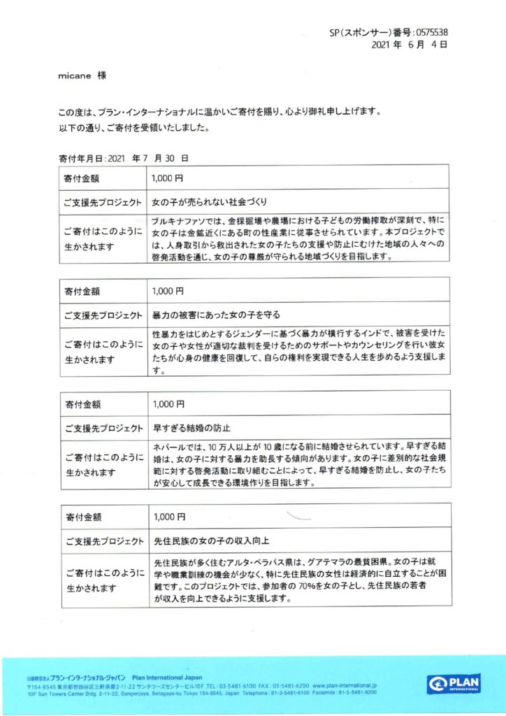 国際NGOプラン・インターナショナルへの2021年7月の寄付【9000円】