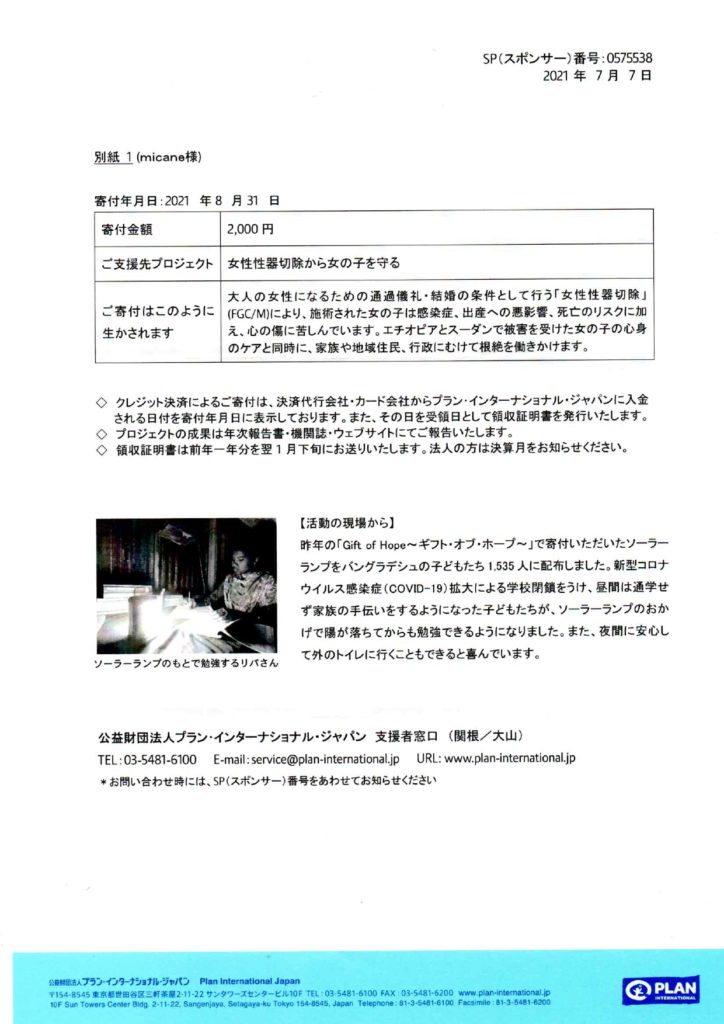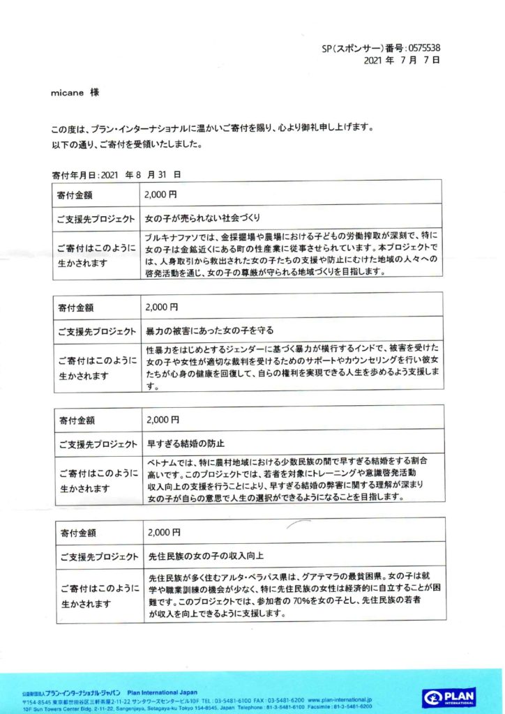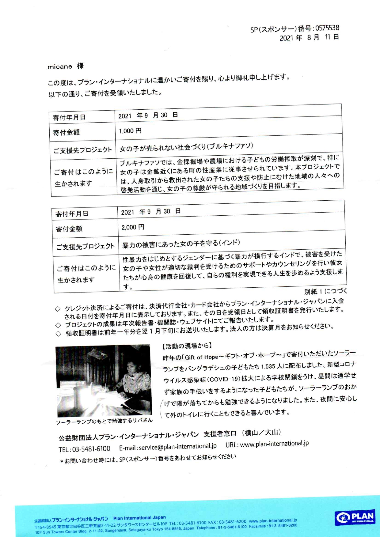 国際NGOプラン・インターナショナルへの2021年8月の寄付【7000円】