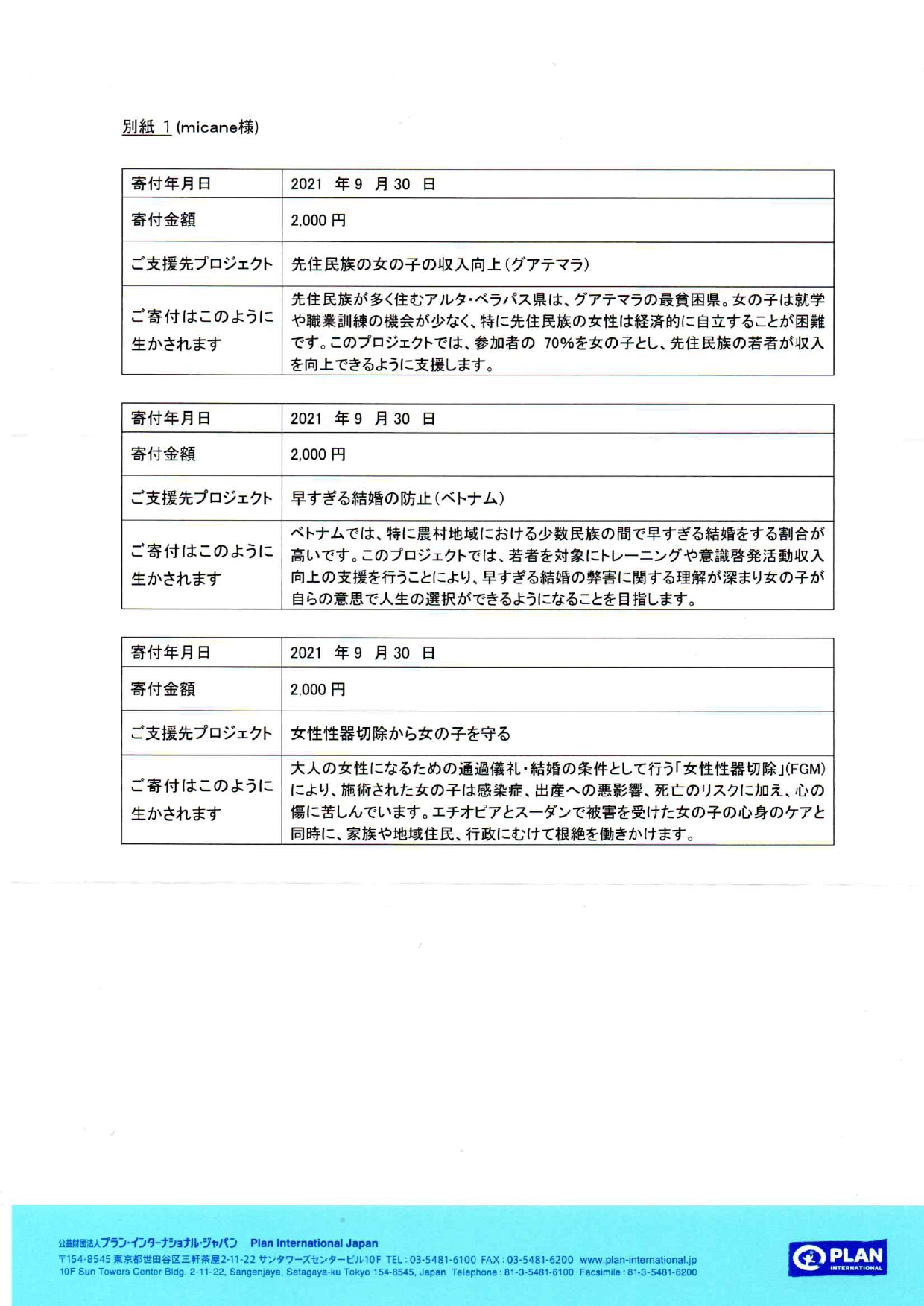 国際NGOプラン・インターナショナルへの2021年9月の寄付【9000円】