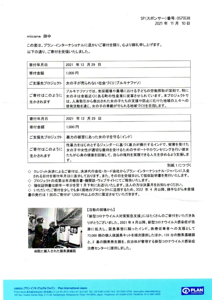 - 13 国際NGOプラン・インターナショナルへの2021年11月の寄付【7000円】