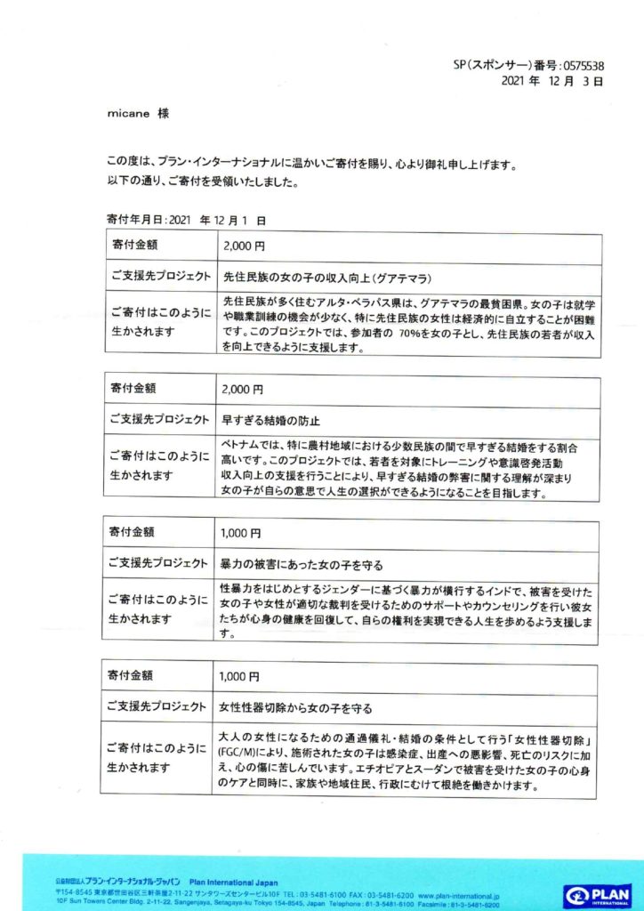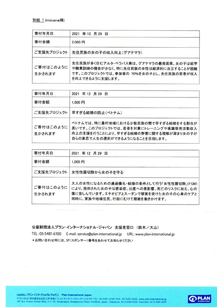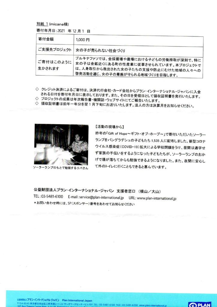 - 14 国際NGOプラン・インターナショナルへの2021年12月の寄付【9000円】