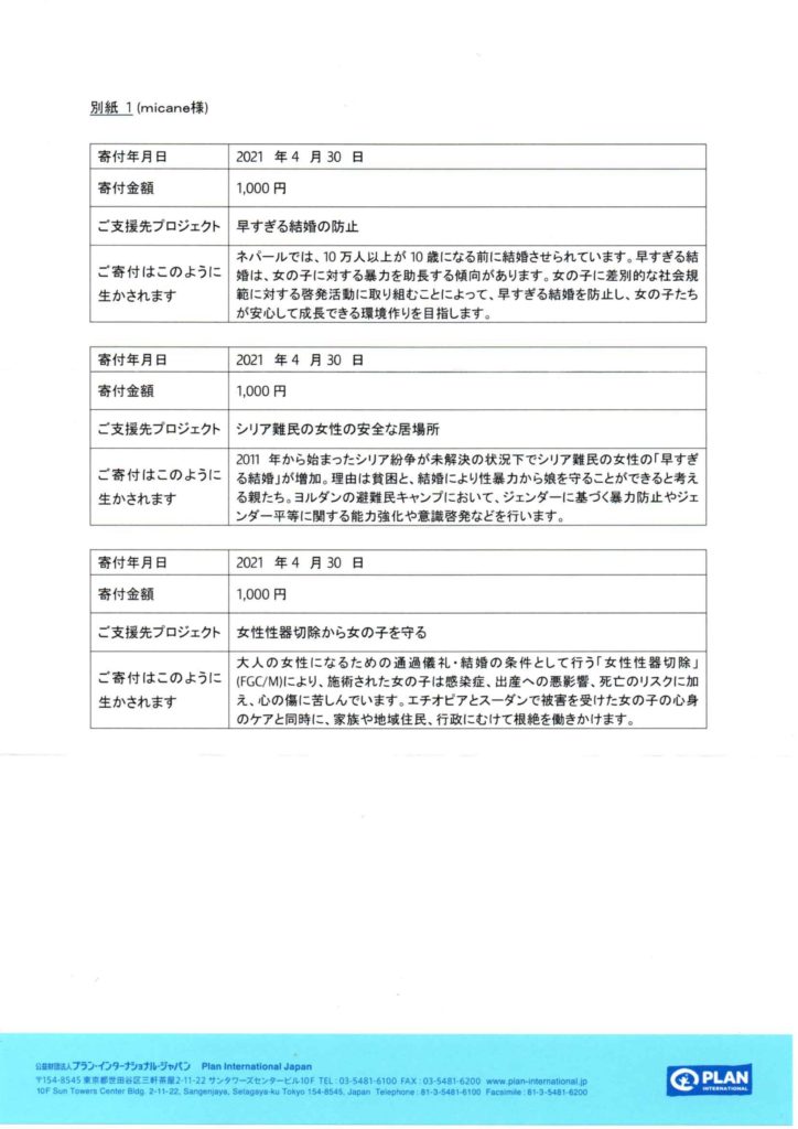 - 6 国際NGOプラン・インターナショナルへの2021年4月の寄付【5000円】
