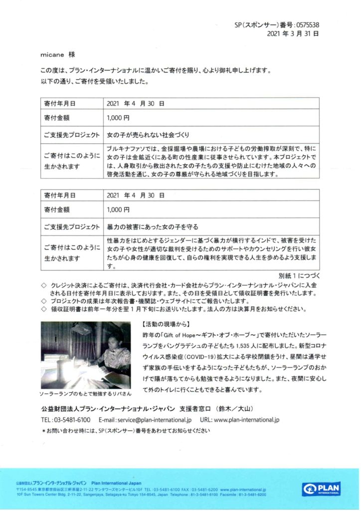 - 5 国際NGOプラン・インターナショナルへの2021年3月の寄付【5000円】